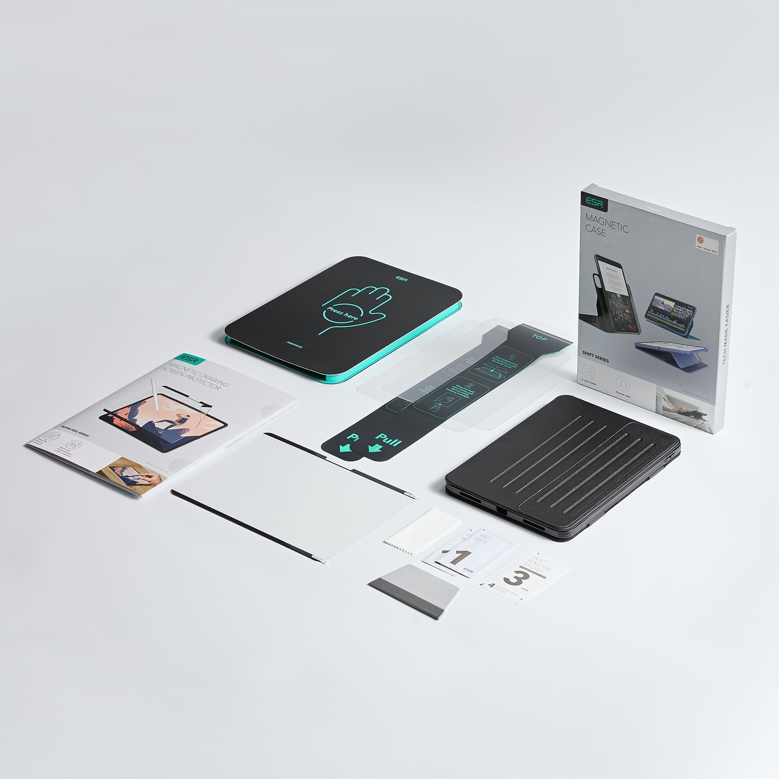 In the Box: Shift Magnetic Case, 2 Armorite® Screen Protectors, Paper-Feel Magnetic Screen Protector, cleaning kits, and installation tray,Pro-grade 360° safety and HD clarity.