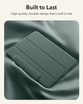 This iPad case features a strong magnetic attachment, durable materials for long-lasting use, and full support for Apple Pencil Pro with wireless charging compatibility. Its slim, lightweight design offers easy portability, while the front cover doubles as a stable stand for viewing, typing, and drawing.