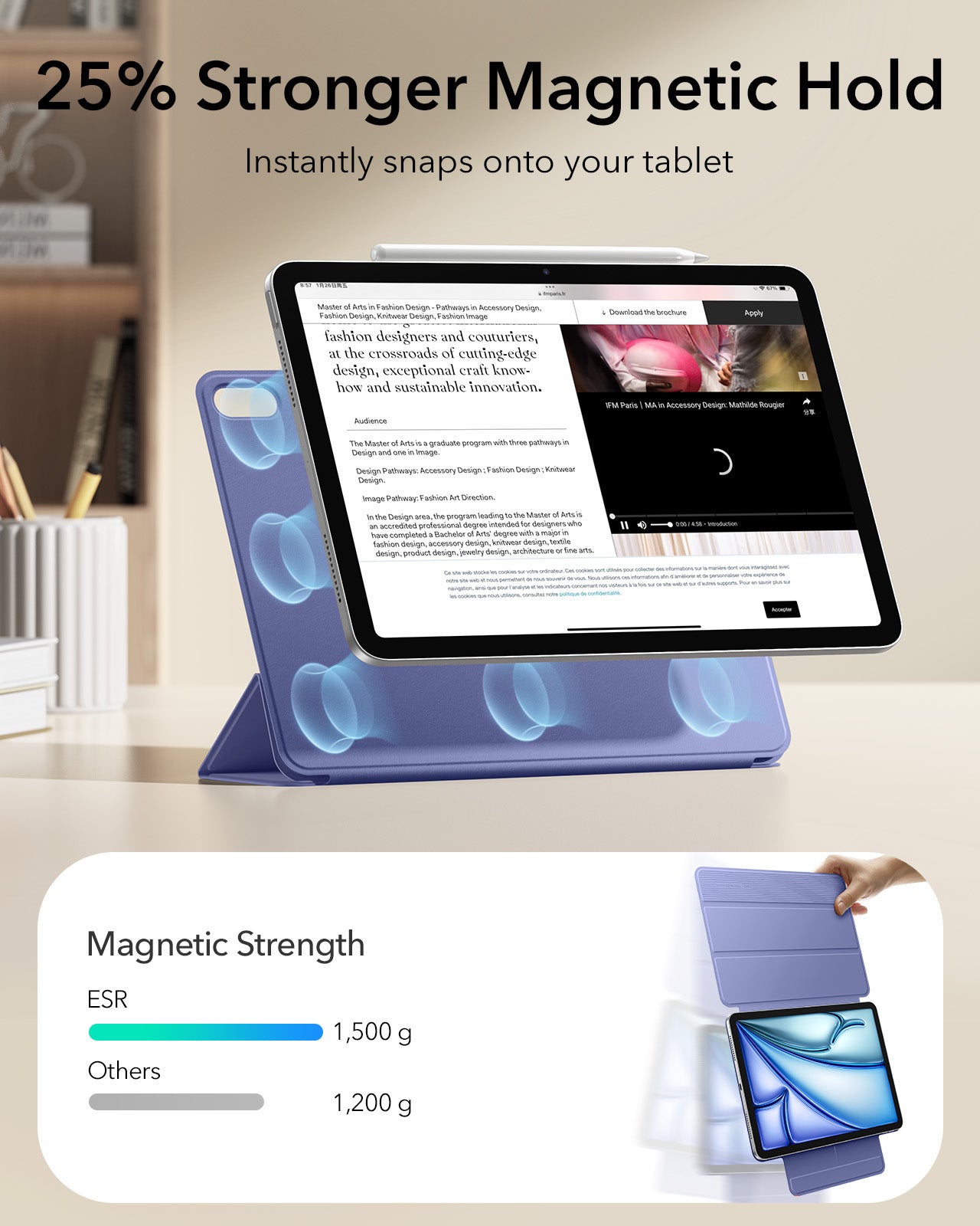 This iPad case features a strong magnetic attachment, durable materials for long-lasting use, and full support for Apple Pencil Pro with wireless charging compatibility. Its slim, lightweight design offers easy portability, while the front cover doubles as a stable stand for viewing, typing, and drawing.